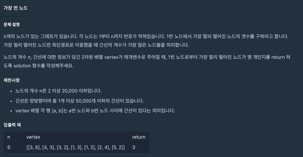 가장 멀리 떨어진 노드란? → 최단 경로로 이동했을 때 간선의 개수가 가장 많은 노드를 의미한다.