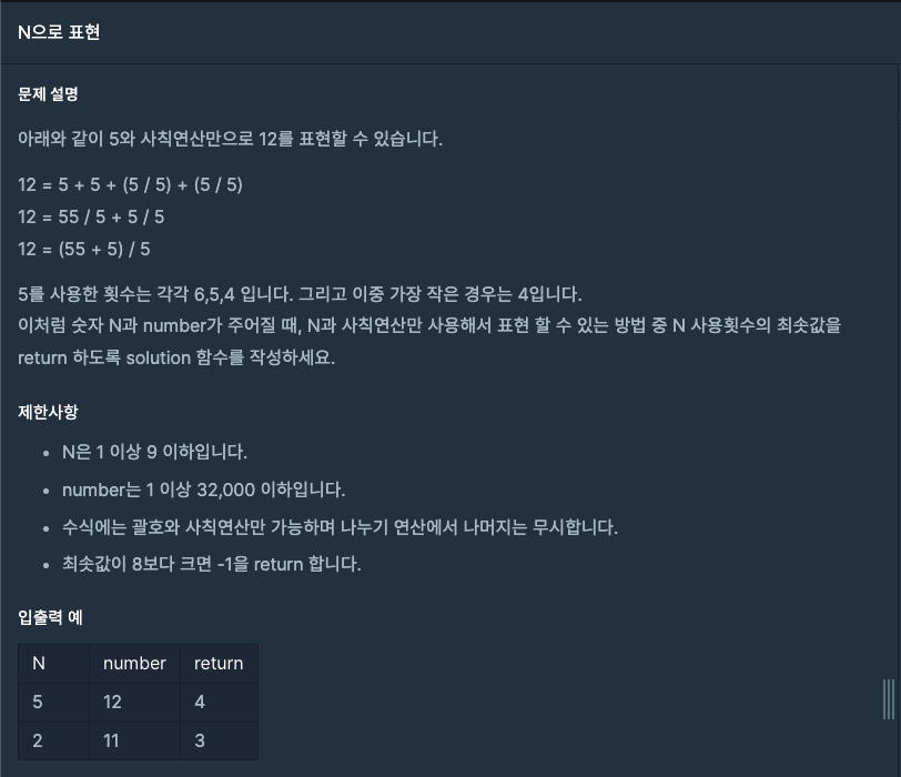 어떤 숫자 N과 numbers가 주어질 때, N과 사칙연산만 사용해서 numbers를 표현해야 한다.