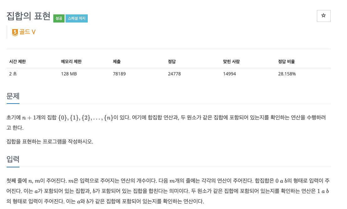 초기에 n+1개의 집합 {0}, {1},… {n} 이 있다. 여기에 합집합 연산과, 두 원소가 같은 집합에 포함되어 있는지를 확인하는 연산을 수행하려고 한다.