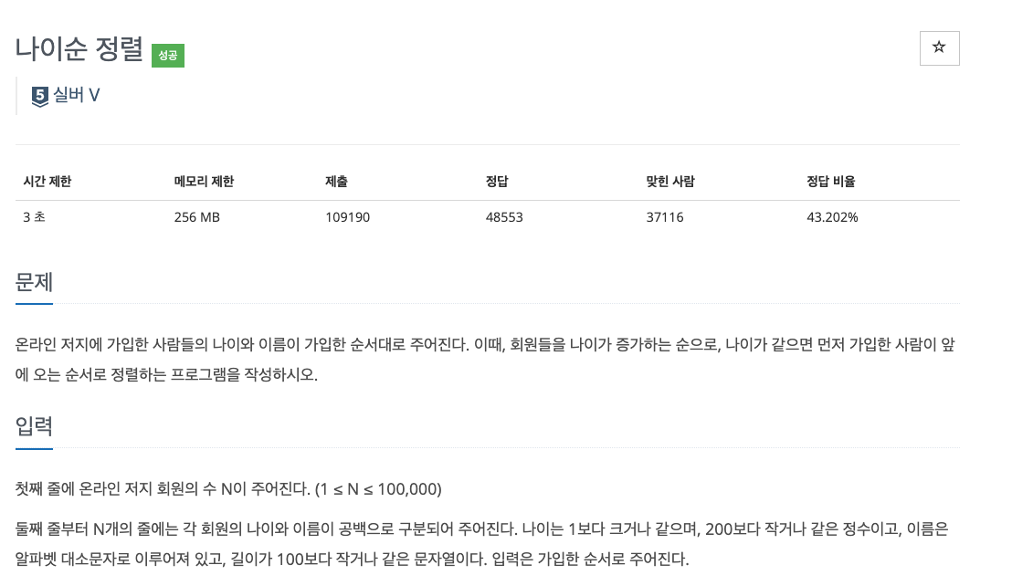 온라인 저지에 가입한 사람들의 나이와 이름이 가입한 순서대로 주어진다. 이때, 회원들을 나이가 증가하는 순으로, 나이가 같으면 먼저 가입한 사람이 앞에 오는 순서로 정렬하는 프로그램을 작성하시오.