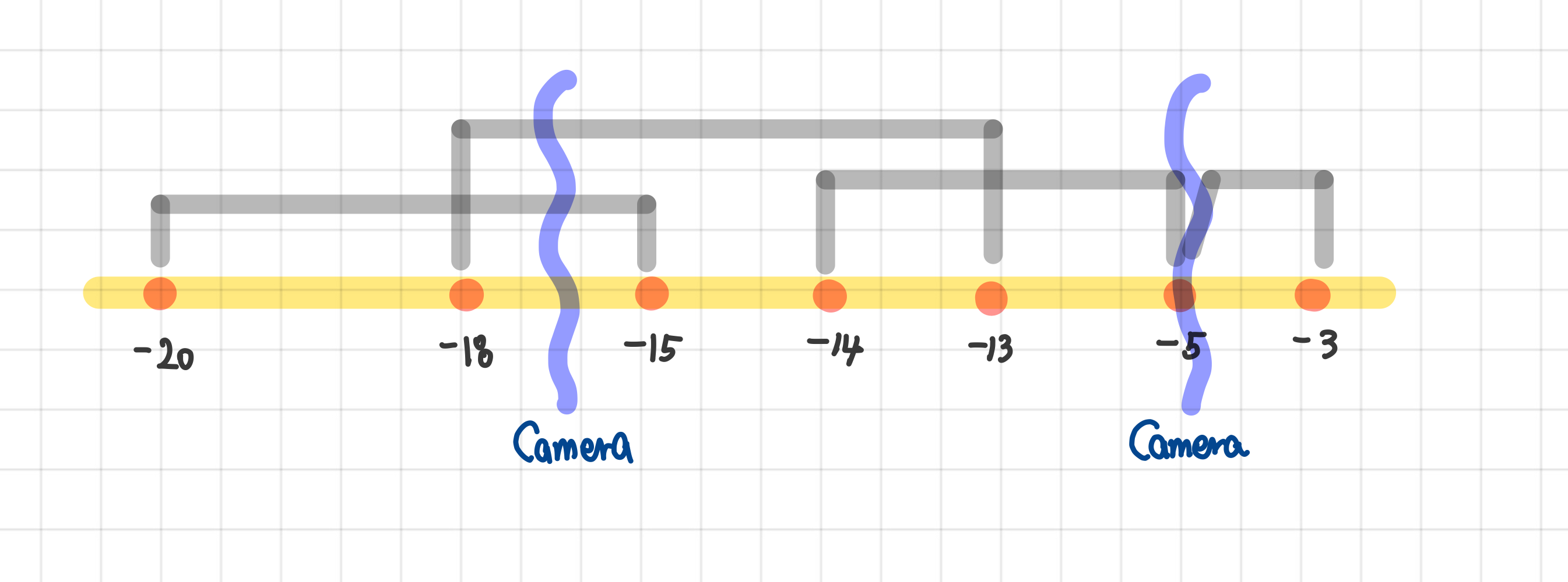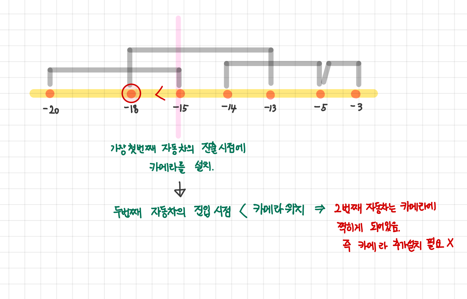 - 예시에서 카메라는 다음과 같이 설치될 수 있다. 하지만 최대한 많은 차가 겹치도록 하기 위해서는 중간 보다는 진출 또는 진입시점에 설치하는게 좋다.