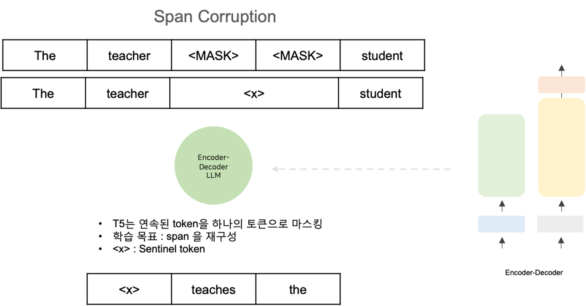 T5 같은 경우, 입력 토큰의 무작위 시퀀스를 뽑아 마스킹하는 Span corruption을 사용해서 인코더를 사전학습 합니다. 그런 다음 이러한 대량 시퀀스는 고유한 Sentinel token으로 대체되며, 여기서는 <x>로 표시됩니다.