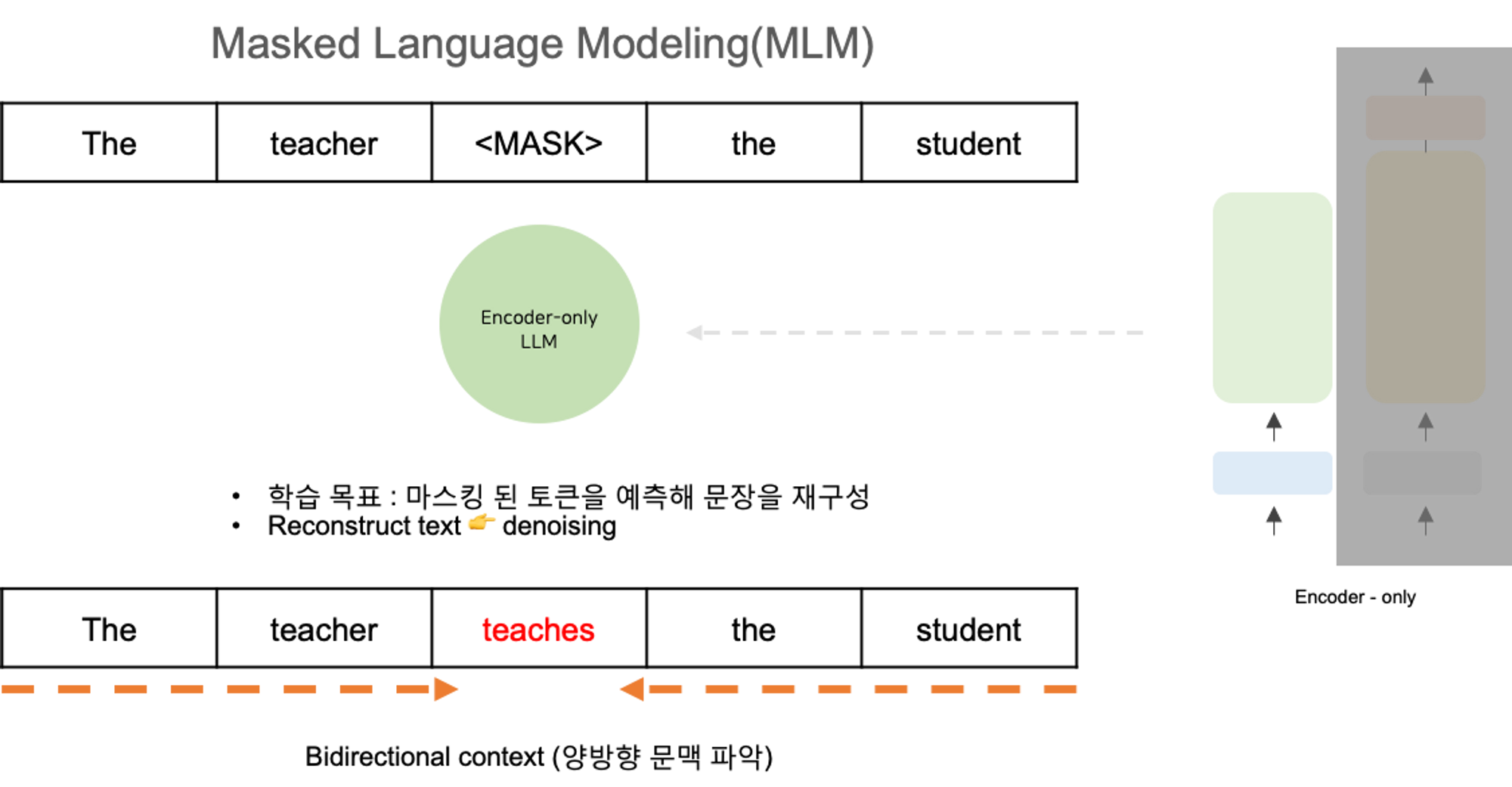 Autoencoding model은 입력 시퀀스의 양방향(bi-directional) 표현을 학습해서 앞에 오는 단어뿐만 아니라 전체 문맥을 이해하도록 합니다. 따라서 Encoder-only 모델은 양방향 context의 이점을 활용하는 task에 적합합니다.