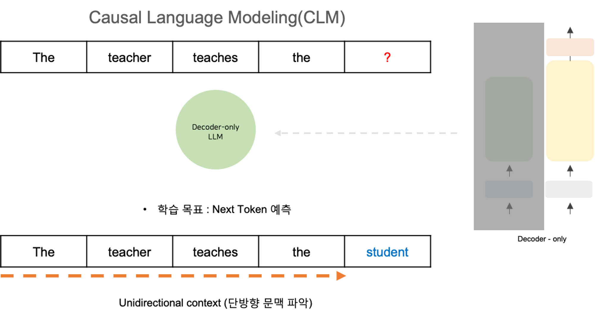 여기서 training objective 는 이전 토큰 시퀀스를 기반으로 다음 토큰을 예측하는 것입니다.