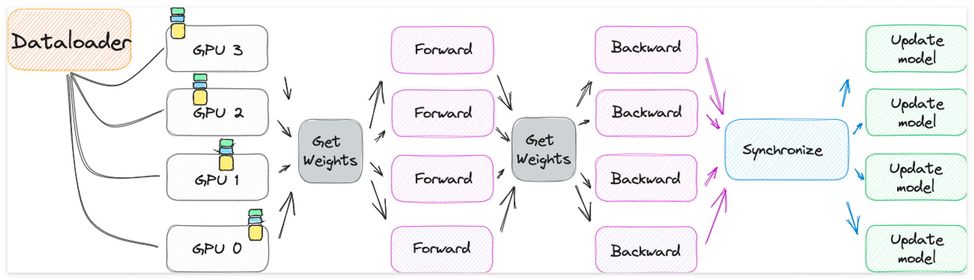 다음 그림처럼 Dataloader의 도움을 받아 각 GPU의 데이터를 분산시켜 처리하는 과정으로 동작합니다.