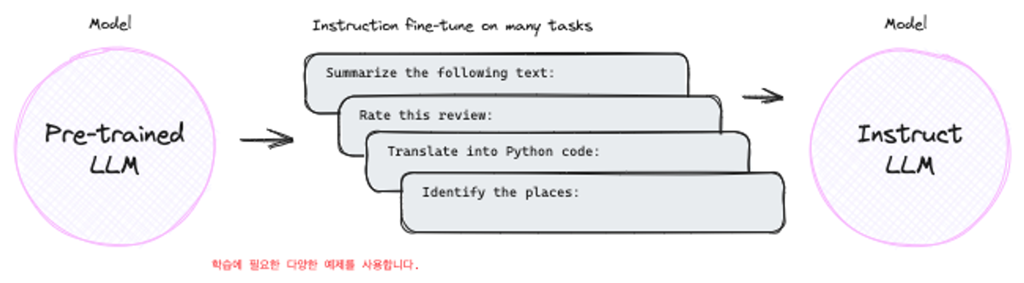 Multi-task 파인튜닝은 single task 파인튜닝의 확장입니다. 그래서 학습 데이터셋은 여러 Task에 대한 Input-Ouput 예제들로 구성되어 있습니다.