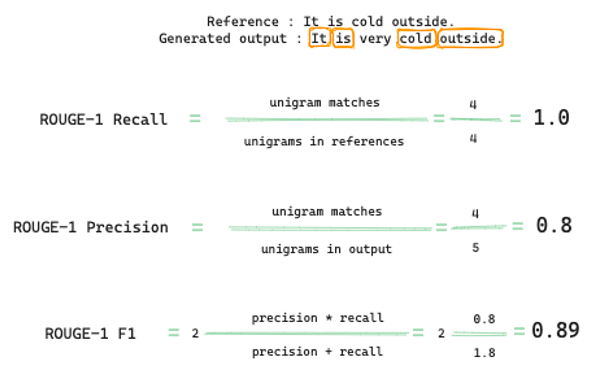 그렇다면 위 예에서는 reference 내의 cold 수가 1개이므로, ROUGE- 1 Precision은 1/4로 0.25의 값을 갖게 됩니다.