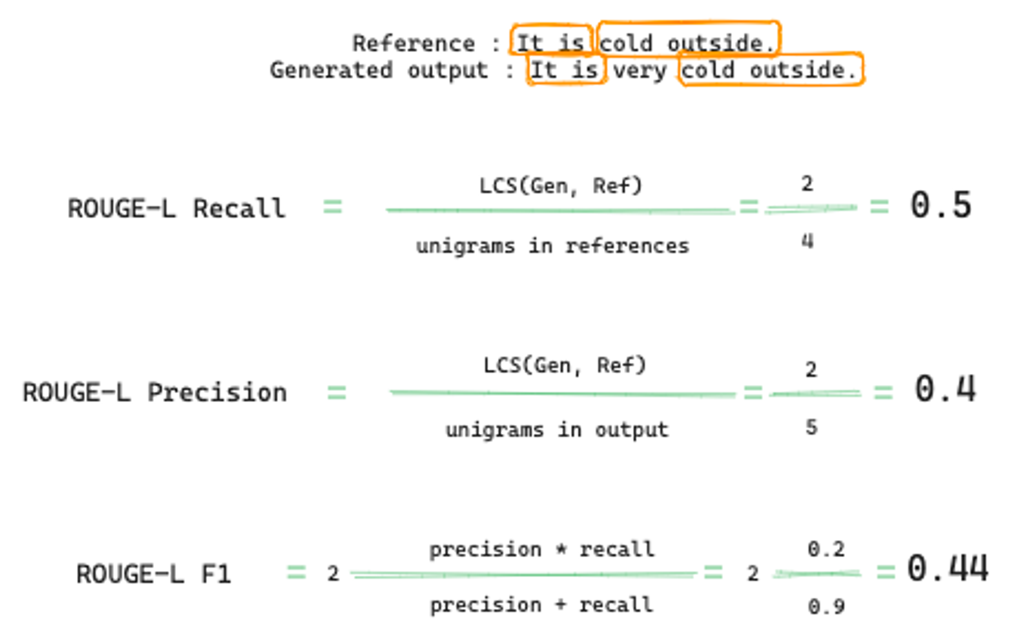 - References와 Generated output의 LCS는 → (It is)와 (cold outside)입니다.