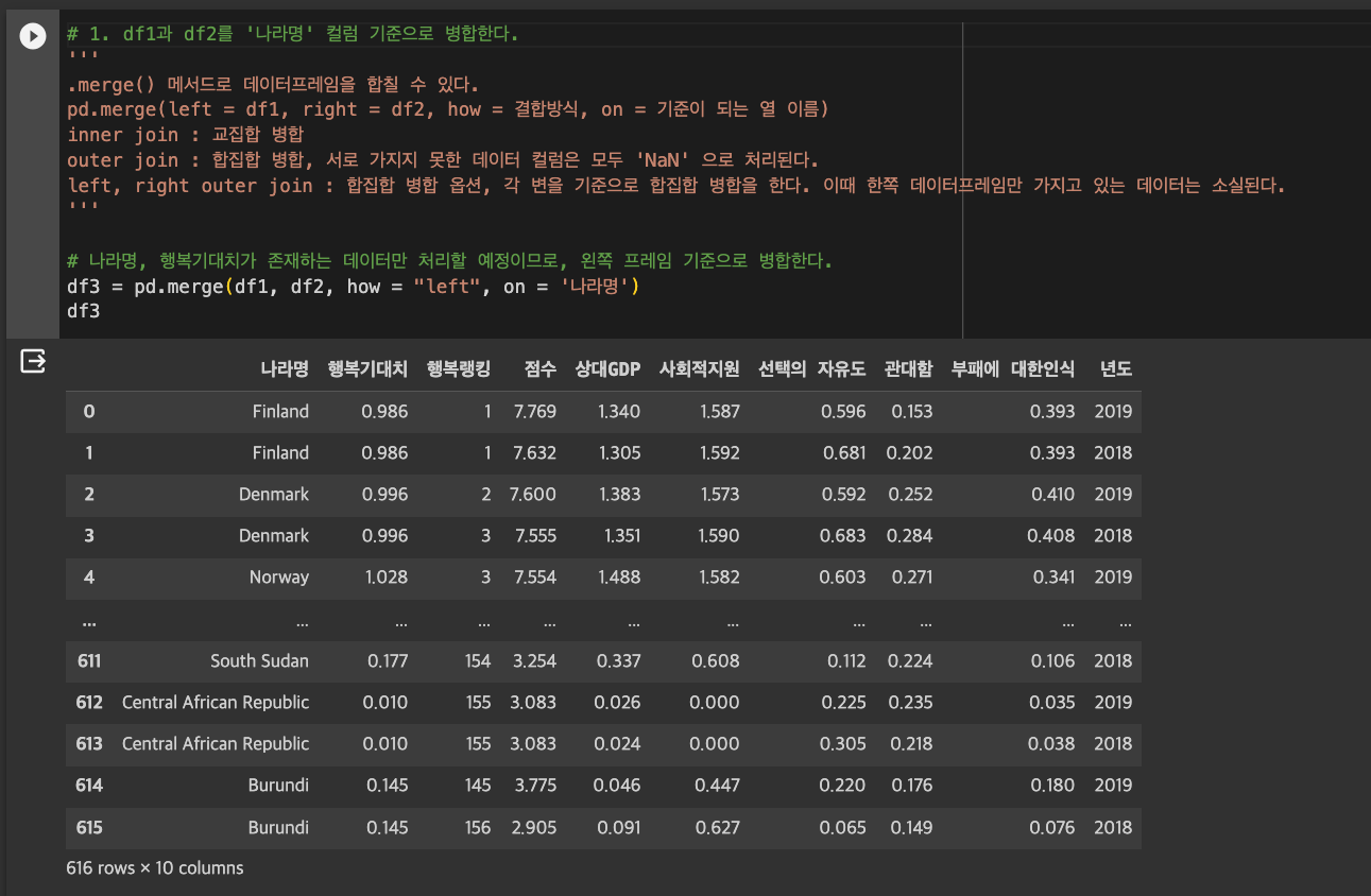- df1과 df2를 '나라명' 컬럼 기준으로 병합한다.