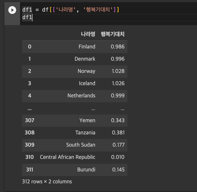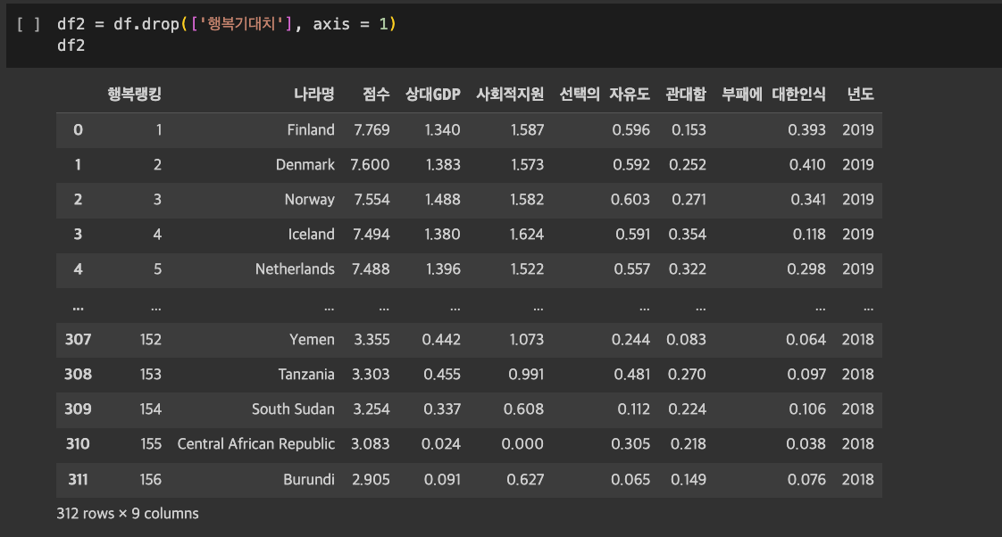 - 오리지널 데이터프레임 : 나라명, 점수, 상대GDP, 사회적지원, 행복기대치, 선택의 자유도, 관대함, 부패에 대한인식, 년도