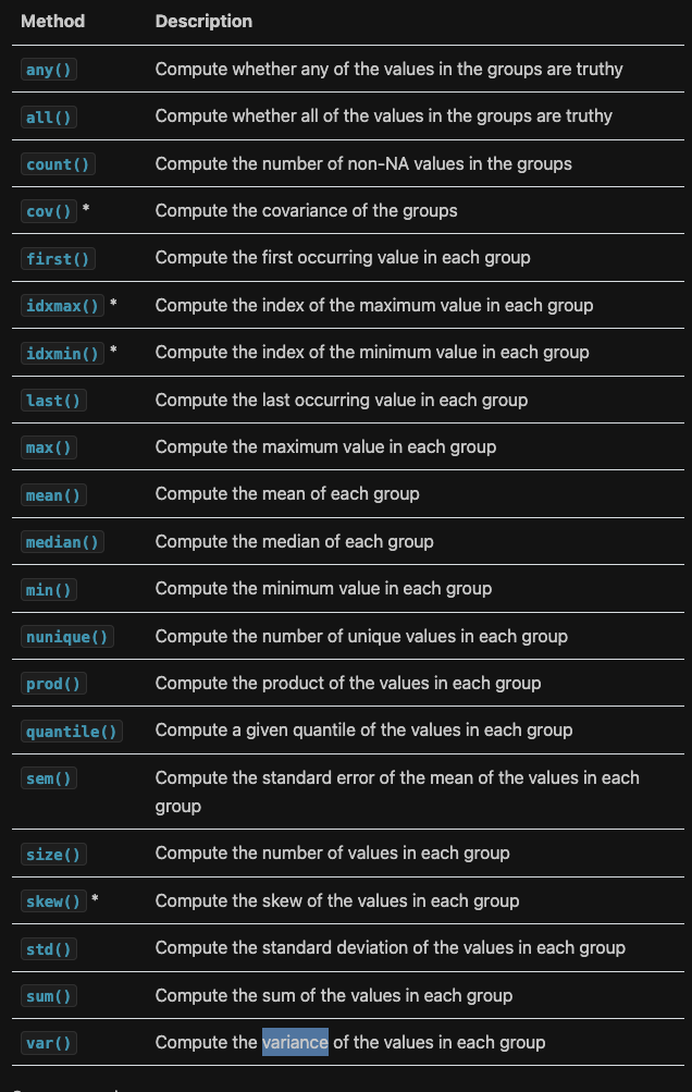그룹화하고 나서 각 컬럼에 대해 어떤 집계를 하고 싶을 때 유용한 함수가 있었다.