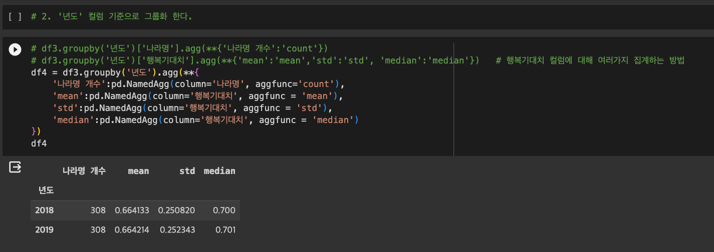 - 완성된 데이터프레임을 '년도' 컬럼 기준으로 그룹화한다. -> 나라명 개수, 행복기대치의 평균, 표준편차, 중간값을 구한다.