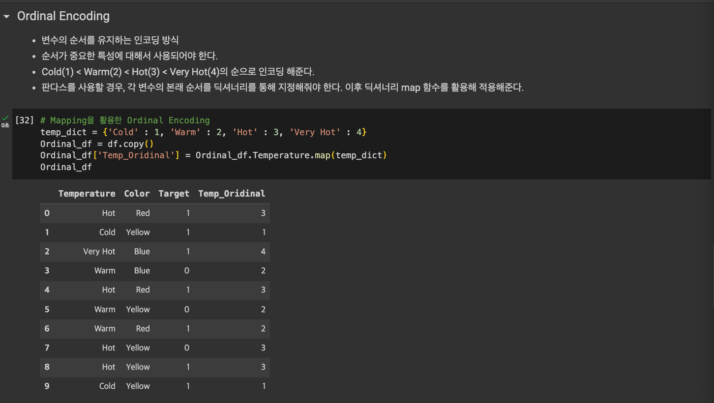 - 인코딩을 통해, 범주형 변수의 유용한 정보를 보존할 수도 있다. 때론 모델의 성능을 향상해 준다.