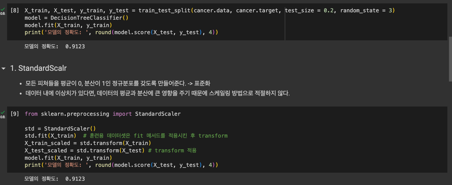 데이터셋과 알고리즘에 따라 가장 적절한 스케일링 방법이 달라서 그런가 모델의 성능이 달라짐을 확인할 수 있었다.