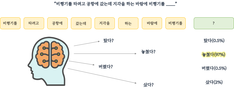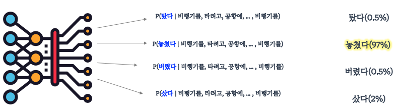 기계도 비슷합니다. 앞에 어떤 단어들이 나왔는지 고려하여 후보가 될 수 있는 여러 단어들에 대해서 확률을 예측해보고 가장 높은 확률을 가진 단어를 선택합니다.