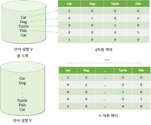 - 문장 시퀀스 내 i번째 단어가 단어집합 개수 |V| 만큼 One-hot encoding 된다.