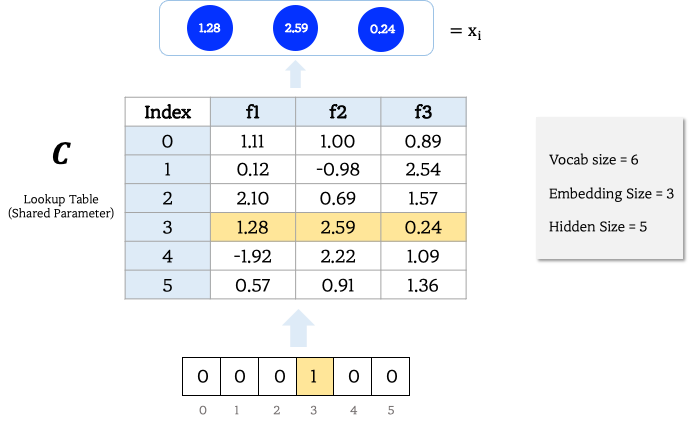 - Shared Parameter 인 Lookup Table의 index를 참조해 Distributed Representation을 얻는다. (Lookup Table C는 학습되는 파라미터 입니다.)