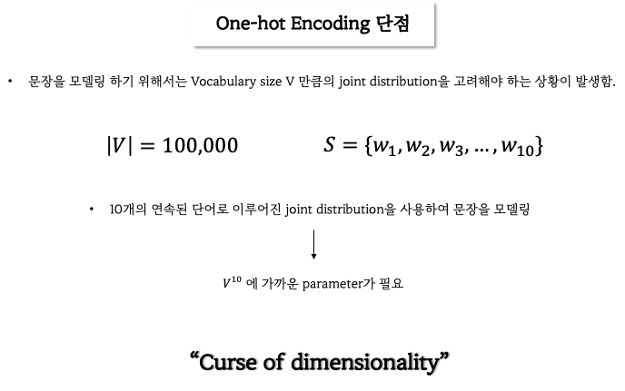 One-hot encoding은 각 단어를 단어집합 개수와 동일한 차원 수로 임베딩을 하게 되는데 이 때 단점은 단어 집합의 개수가 아주 클 때 단어의 임베딩 차원이 아주 커져 차원의 저주가 발생할 수 있습니다.