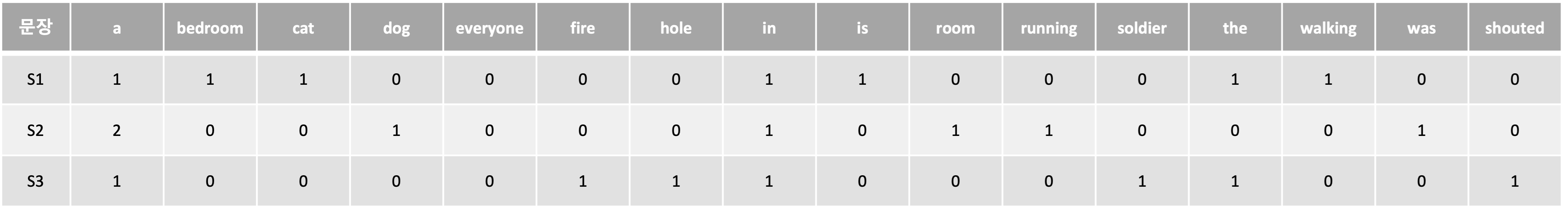 3개의 문장에서 S1과 S2는 매우 유사한 반면 S3은 다른 문맥을 가지고 있는 문장이다. 이 문장들을 16차원의 unigram으로 벡터화 해서 각각의 문장 유사도를 구해보면 one-hot encoding의 단점을 알 수 있습니다.