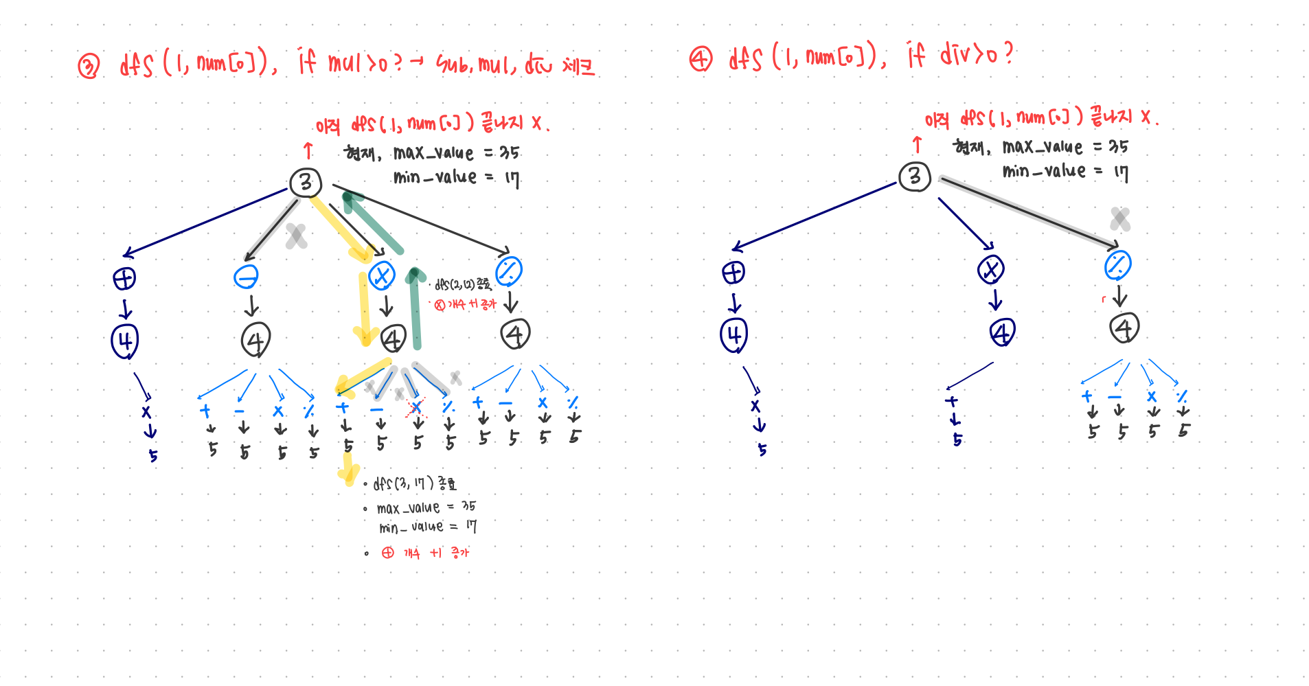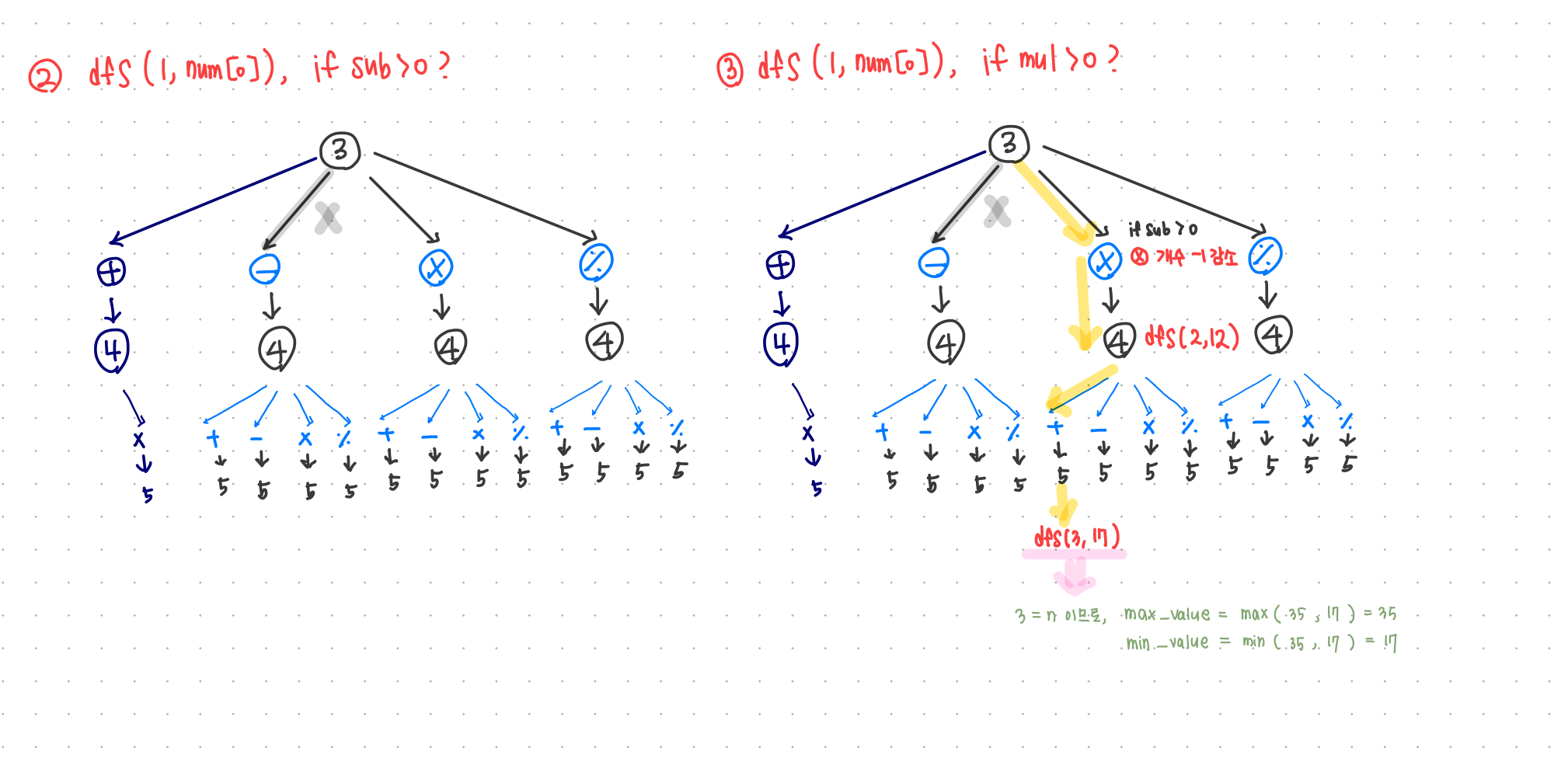 - dfs(2, 12)에서도 덧셈 -> 뺄셈 -> 곱셈 -> 나눗셈 순으로 연산자 개수를 확인하고 개수가 0이면 계산하지 않고 넘어간다.