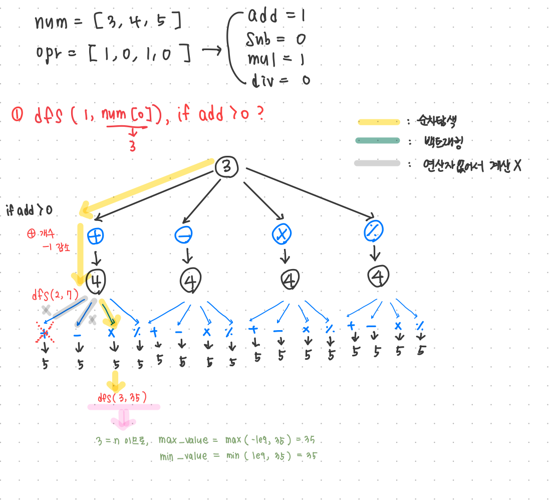 처음에 코드를 보고 dfs 함수에서 if문으로 연산자마다 dfs 함수를 재귀호출 하는게 어떻게 모든 경우의 수를 커버할 수 있는지 한번에 이해하기는 어려운 것 같다.