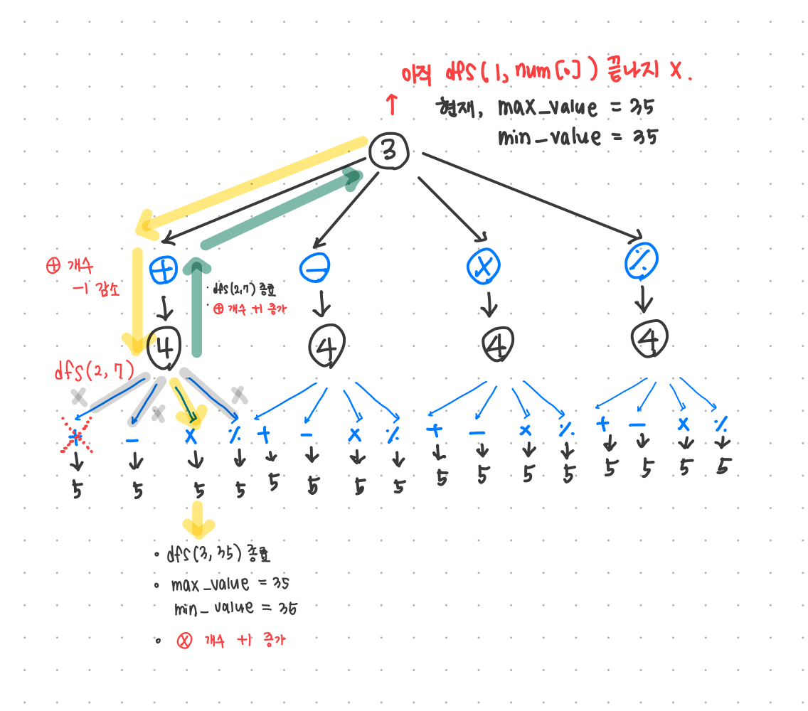 - dfs(2, 7)에서도 덧셈 -> 뺄셈 -> 곱셈 -> 나눗셈 순으로 연산자 개수를 확인하고 개수가 0이면 계산하지 않고 넘어간다. (빨간 점선 엑스표는 전 dfs 호출에서 한번 썼기 때문에 0이 되어서 사용하지 못함)