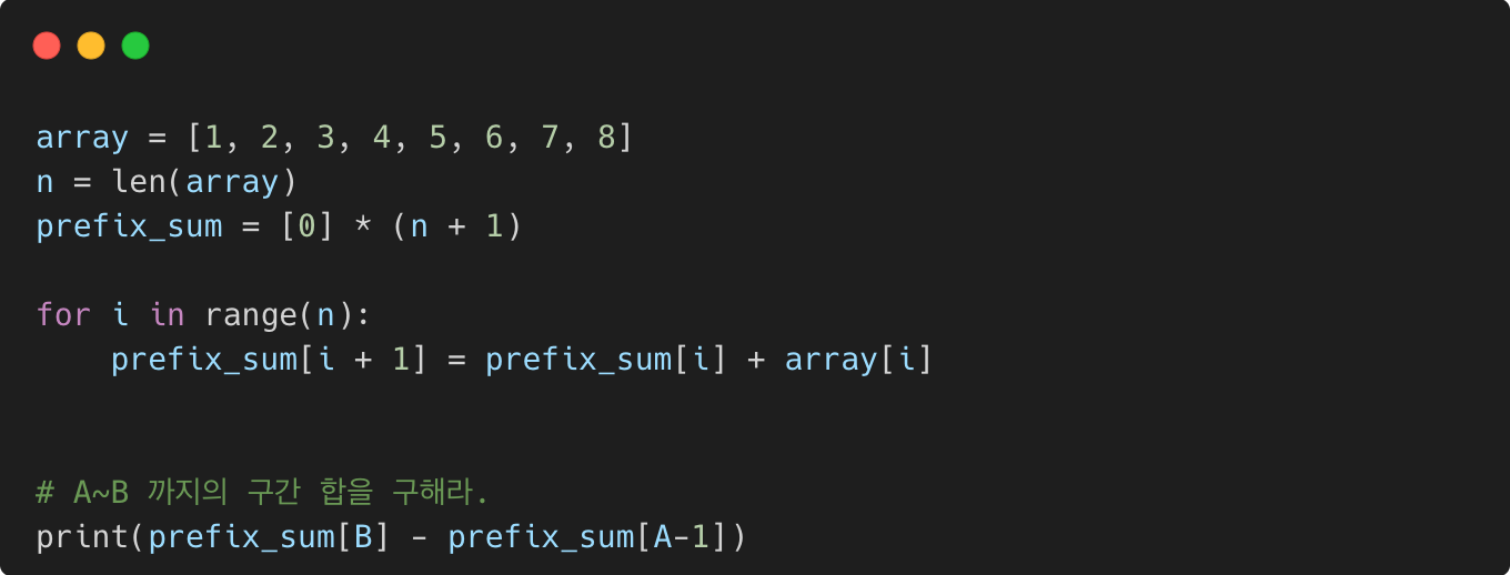 누적합 배열을 구현 코드의 기본틀은 다음과 같다. 기억해서 활용하자.