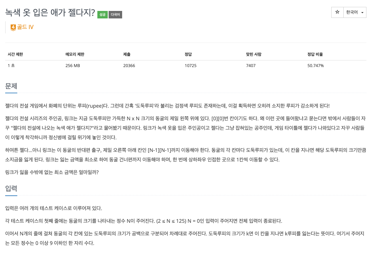 주인공 링크는 현재 도둑루피가 가득한 N*N 크기의 동굴안에 젤 안쪽에 있다. ([0][0]에 위치)